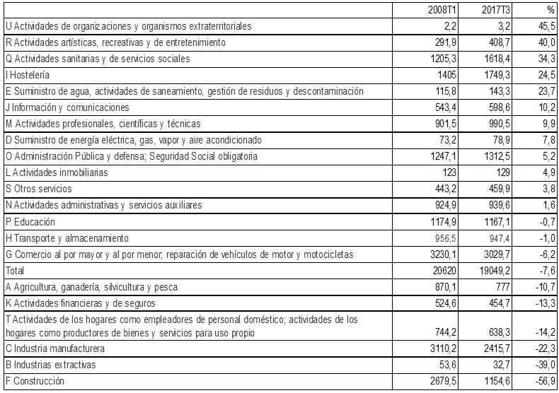 En el extremo opuesto, el empleo se reduce de forma significativa en la construcción, las industrias extractivas y la industria manufacturera, con porcentajes superiores al 20%. De especial significado el descenso del empleo en las actividades financieras y de seguros, un 13,3% que acusa los ajustes realizados en este sector por la crisis y que continuarán por la irrupción de las nuevas tecnologías.