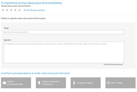 Educaweb ha incorporado más novedades en la ficha de los centros. A partir de ahora, puedes puntuar y opinar sobre los centros educativos. ¡Tu experiencia es muy valiosa! Ayuda a los otros estudiantes a tomar la decisión adecuada.