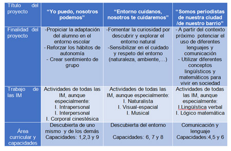 En cada proyecto se plantea un tema a desarrollar como eje de trabajo de un área específicamente, aunque las demás se trabajan también de forma trasversal. En el proyecto se han definido unos objetivos relacionados con las capacidades que propone el currículo infantil, y se han propuesto varias actividades, así como el sistema de evaluación acorde, desde las IM como planteamiento orientativo para que cada maestra pueda ajustar el proyecto a las particularidades de su grupo. A continuación un resumen de tres proyectos: