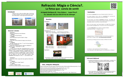 Los chicos trabajaron muy independientemente pero con las chicas pude colaborar así que pude comprobar que en un par de sesiones el enigma científico de la refracción y la formación de imágenes por una lente convergente (el vaso con agua) daban respuesta a lo que en un principio parecía mágico. Ahora bien, plasmar todo el proceso en un póster científico A0 que ICFO les pedía para valorar el interés de su ponencia, les llevó a las pobres tres meses. Por su parte, escribir un Abstract de trescientas palabras, en inglés, les resultó muy rápido.