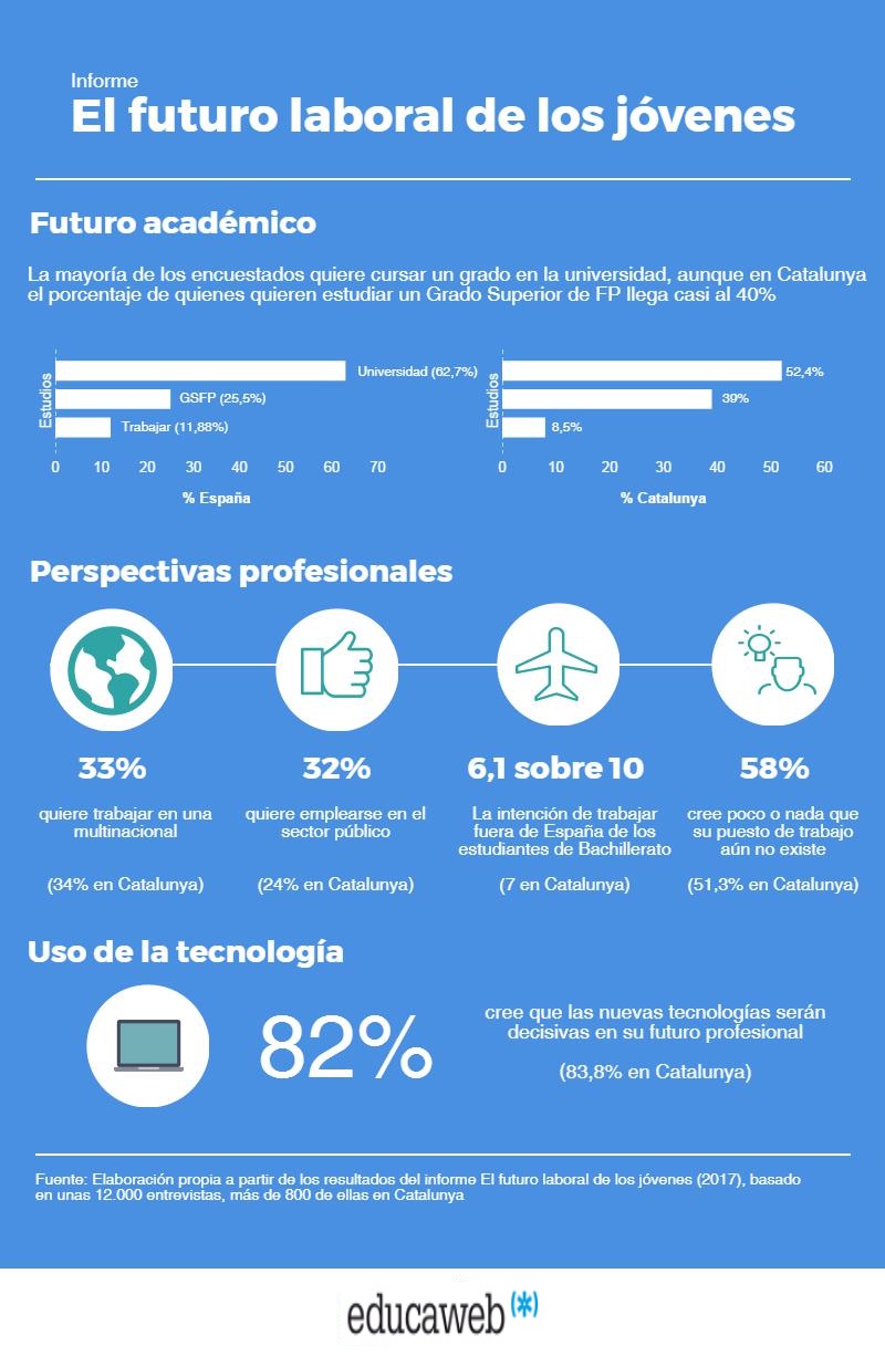 El estudio ha querido ir más allá del futuro académico y ha preguntado por las perspectivas profesionales de los jóvenes de entre 16 y 19 años. A un tercio de ellos les gustaría trabajar en una multinacional (33% en España; 34%, en Catalunya); y a otro tercio, en el sector público (32% en España, 24% en Catalunya). Crear una empresa propia y trabajar en una Pequeña y Mediana Empresa (PYME) se sitúan en tercer y cuarto lugar, con Catalunya un par de puntos por encima de la media española, lo que ha llevado a Jáuregui a apuntar que "el estudiante catalán es más emprendedor que la media española".