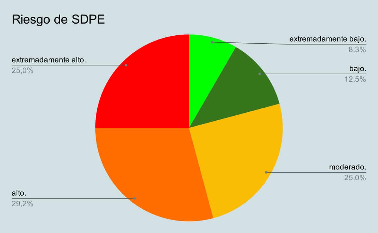 Si nos fijamos en el riesgo de SDPE un 54,2% de los docentes se encuentra en los grupos de riesgo alto y muy alto de SDPE, en tanto un 20,8% pertenece a las categorías baja y muy baja.