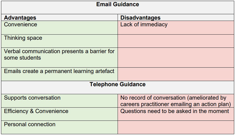 Una de las principales conclusiones del estudio You've got mail! de la Open University sostiene que la orientación académica y profesional realizada por teléfono funciona "notablemente mejor" para una mayor proporción de estudiantes. La media combinada de los estudiantes que respondieron "muy de acuerdo" y "de acuerdo" en las veintidós métricas utilizadas para medir su interacción con un orientador profesional y empleabilidad fue, por término medio, un 20% mayor para la orientación telefónica en comparación con la orientación electrónica.