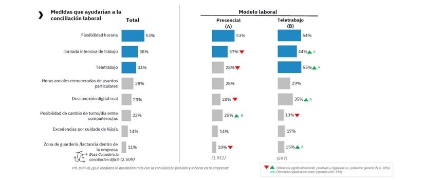 El estudio destaca que solo el 41% de las personas trabajadoras consultadas en 2022 afirma que tiene facilidades de conciliación, una cifra similar a la del año pasado, cuando, según la misma encuesta, un 40% indicaba que contaba con medidas conciliadoras en su ámbito laboral.